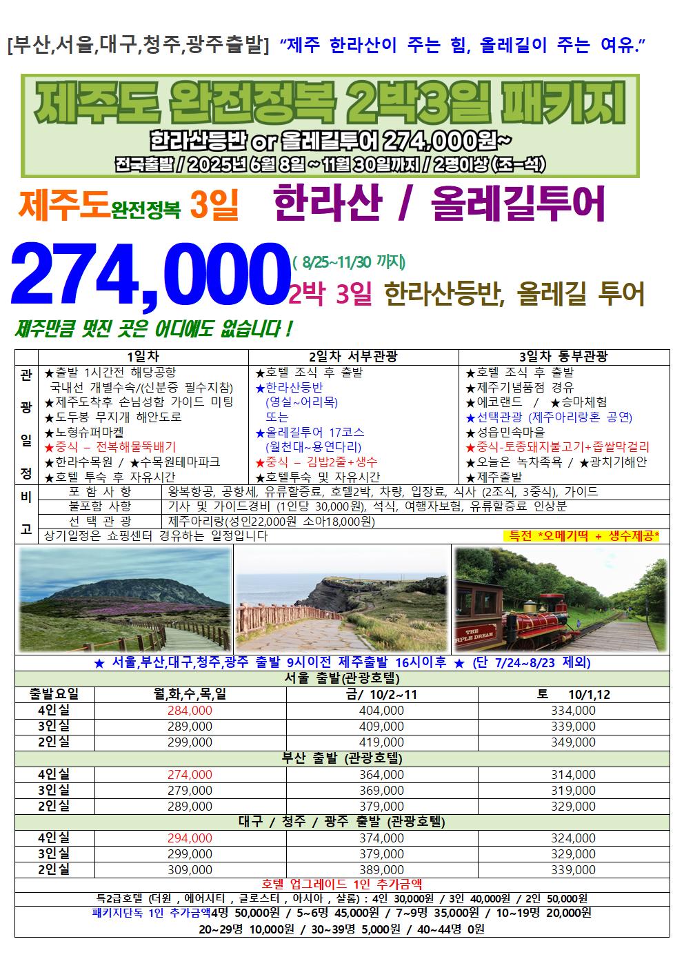 [서울, 울산, 대구, 청주, 광주, 부산 출발] 제주도 3일  제주 한라산이 주는 힘, 올레길이 주는 여유.”한라산+올레길  멋진 아름다움을 느껴보자!!!