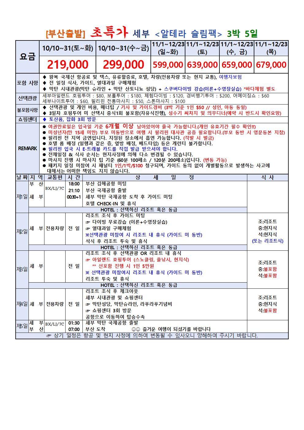 [부산 출발] 세부 3박 5일 특가- 세부에서 멋진 경험을 느껴보자- 알테라 슬림팩 GBBC333-AS